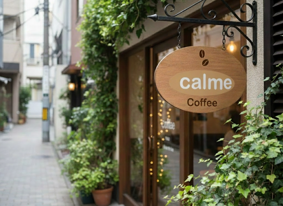 架空カフェ「Cafe Calme」のロゴを制作しました。ターゲットは20〜30代女性で、通勤・通学前の朝や午後のリラックスタイムに訪れる層を想定。ロゴは安心感と親しみやすさを意識して丸みのある書体を採用し、配色は焙煎したコーヒー豆の色とミルクの白を基調にベージュを加え、カフェラテのまろやかさを表現しました。